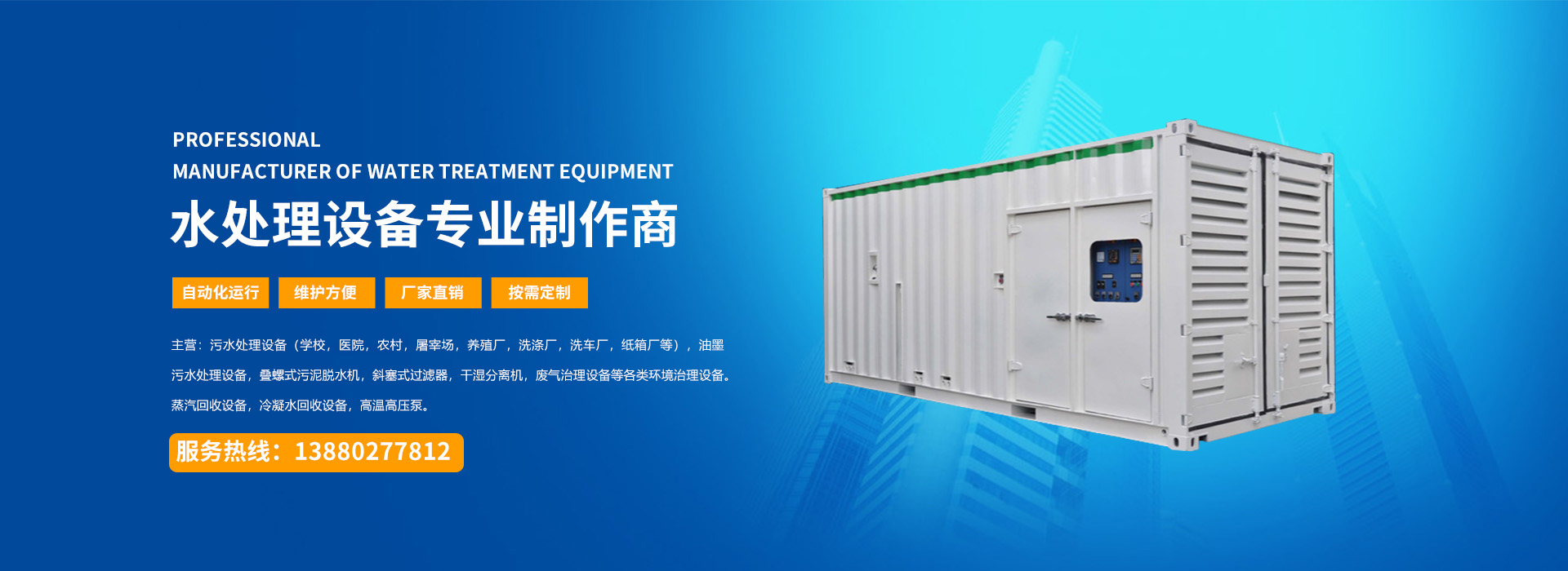 四川宇藍環(huán)保工程有限公司是水處理設備及各類環(huán)境治理設備的生產(chǎn)廠家并承接各類環(huán)境治理設備的工程項目。 公司專門從事各類環(huán)境治理設備及冷凝水蒸汽回收設備的開發(fā)、設計、制造、銷售以及技術(shù)服務的綜合性公司,主要產(chǎn)品有:污水處理設備(學校,農(nóng)村,屠宰場,養(yǎng)殖場,醫(yī)院,小區(qū),紙箱廠,洗滌廠等),油墨污水處理設備,疊螺式污泥脫水機,斜塞式過濾器,干濕分離機,廢氣治理設備等各類環(huán)境治理設備以及蒸汽回收設備,冷凝水回收設備,高溫高壓泵等各類節(jié)能減排的節(jié)能設備。 ...